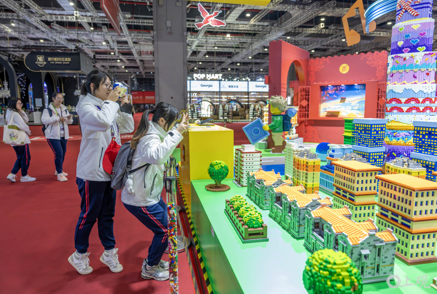 11月4日上午,两位进博志愿者在乐高展区留影。