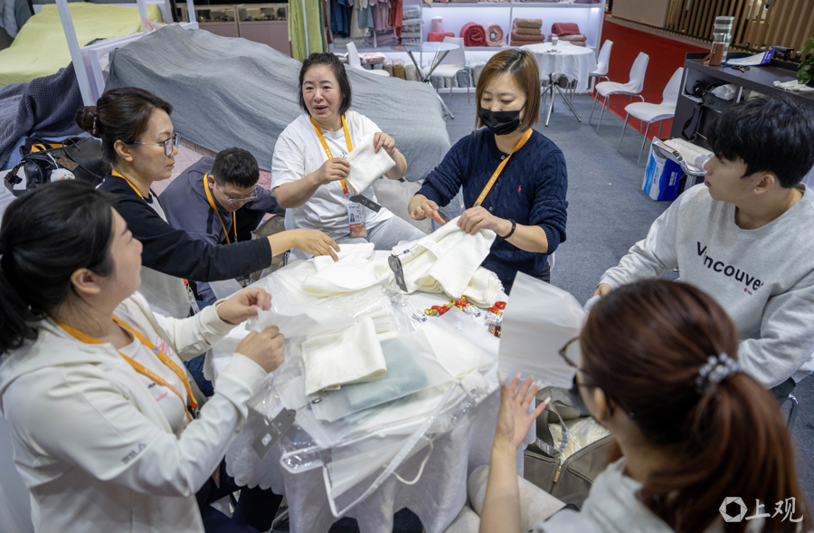 11月4日一早,在消费品展区葡萄牙家居品牌Siuteen的展台上,7位工作人员积极备展,正在为开幕第一天前来展台的观众准备伴手礼。