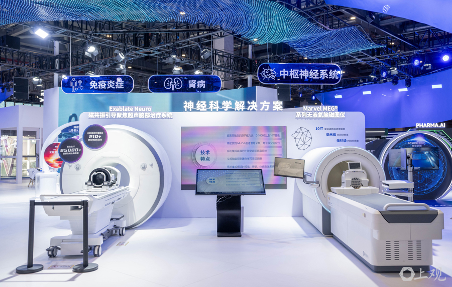 医疗器械及医药保健展区,作为连续八届参展的“全勤生”,复星医药带来了磁共振引导聚焦超声脑部治疗系统(“磁波刀”)、无液氦脑磁图仪等前沿设备。